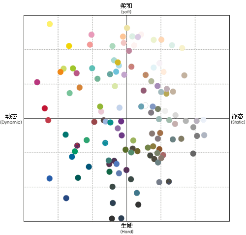 精心篩選出能夠表達(dá)人們對(duì)顏色的感覺的多個(gè)形容詞,然后利用SD方法對(duì)不同工作、生活環(huán)境中的1000個(gè)人進(jìn)行了相關(guān) 的測(cè)試,用于測(cè)試的顏色是色相&色調(diào)(Tue & Tone)表中的116種不同的顏色。“單色印象空間”就是對(duì)這次測(cè)試的數(shù)據(jù)進(jìn)行科學(xué)整理后得到的結(jié)果。從結(jié)果可以獲知,人們對(duì)顏色進(jìn)行評(píng)價(jià)時(shí),最習(xí)慣使 用的4個(gè)形容詞是“柔和(Soft)”、“生硬(Hard)”、“動(dòng)態(tài)(Dynamic)”、“靜態(tài)(Static)。