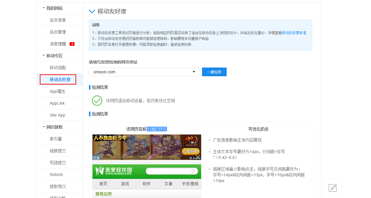 如果上面幾點(diǎn)站長(zhǎng)對(duì)于自己網(wǎng)站調(diào)整還無(wú)從下手的話,可以通過(guò)站長(zhǎng)工具里面的移動(dòng)友好度進(jìn)行評(píng)測(cè),根據(jù)評(píng)測(cè)結(jié)果進(jìn)行網(wǎng)站調(diào)整。