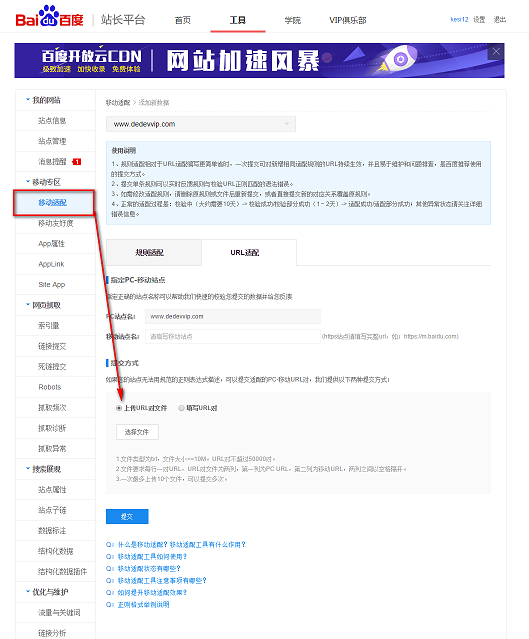 這一點(diǎn)我認(rèn)為尤其重要,因?yàn)樵谠缙诤芏嗑W(wǎng)站沒(méi)有移動(dòng)化站點(diǎn),也并沒(méi)有做自適應(yīng)的處理,這樣就導(dǎo)致m.baidu.com在收錄時(shí),是被百度收錄了的PC頁(yè)面或者被百度轉(zhuǎn)碼,所以我們?cè)谧隽艘苿?dòng)站點(diǎn)后第一件要做的事情就是做好適配,這里站長(zhǎng)學(xué)院介紹了三種適配的方式(參考鏈接:http://zhanzhang.baidu.com/college/courseinfo?id=156),在做完網(wǎng)站的適配之后,站長(zhǎng)也可以將pc站和移動(dòng)站一一對(duì)應(yīng)的關(guān)系在百度站長(zhǎng)平臺(tái)后臺(tái)進(jìn)行提交。