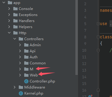 1、在app\http\Controllers文件夾里面創(chuàng)建PC端和移動(dòng)端不同的控制器文件夾,分別對(duì)應(yīng)PC端的路由文件及移動(dòng)端路由文件
