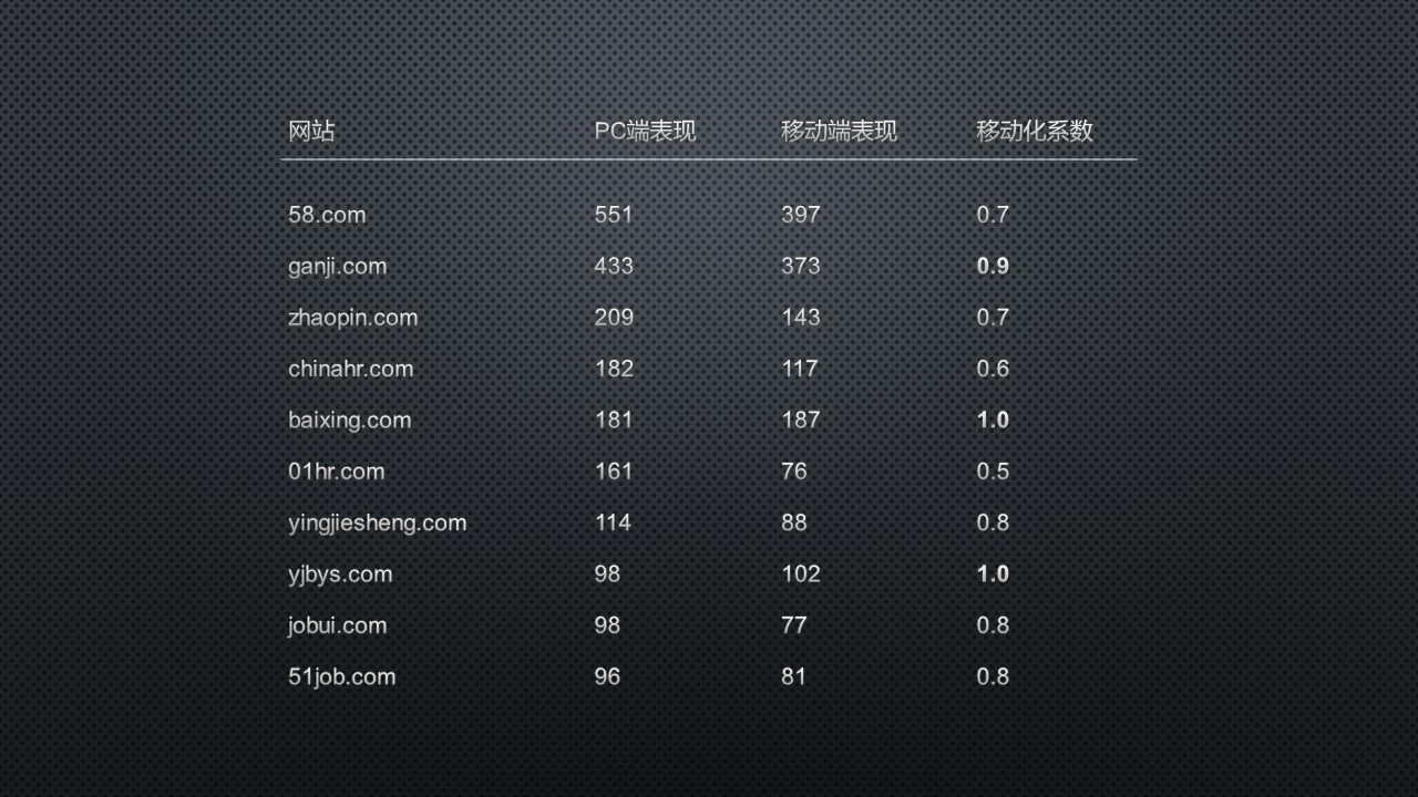 從該數(shù)據(jù)明顯可見的是,三大招聘網(wǎng)站(智聯(lián)、前程無憂、中華英才)的流量其實(shí)并不理想,其流量很顯著的差于58同城和趕集網(wǎng)。