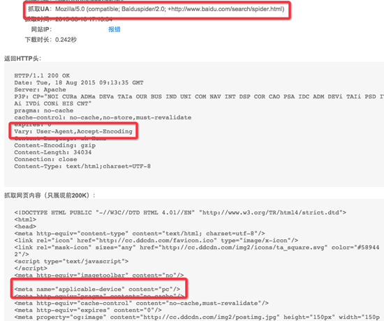 Vary header 加上之后,為了讓百度更好地識別我們的頁面是 PC 還是 Mobile,就需要使用百度自定義的這個 Meta applicable-device 標(biāo)簽了。注意以下來自百度的消息: Meta applicable-device 標(biāo)簽,并非是站點必須標(biāo)注的,現(xiàn)在很多站點沒有標(biāo)記這個標(biāo)簽情況也很好。但這個標(biāo)簽可以幫助百度校驗自己的判斷,并及時進行修正。做這個事情又不麻煩,所以我們建議代碼適配站點為了保證效果,還是加這個標(biāo)簽。