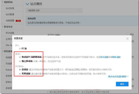 百度站在平臺的設(shè)置里,把網(wǎng)站分為了五類:PC站;有對應(yīng)PC站的移動站;獨立移動站;自適應(yīng)的站點;代碼適配的站點。根據(jù)站點實際情況進行設(shè)置,有利于百度蜘蛛在抓取頁面,以及搜索結(jié)果的排名(PC站和M站的搜索結(jié)果展現(xiàn)機制不一樣)。設(shè)置方法如下: