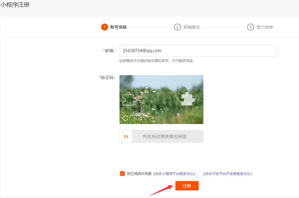 進(jìn)入“小程序注冊(cè)”界面,填寫(xiě)帳號(hào)信息:郵箱、驗(yàn)證碼,勾選服務(wù)協(xié)議,然后點(diǎn)注冊(cè)。
