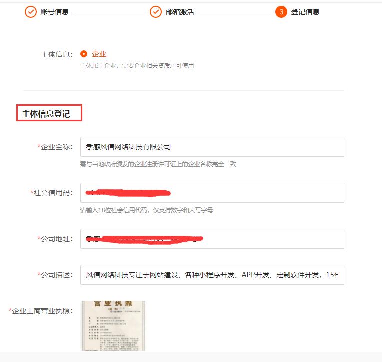 填寫(xiě)“主體信息登記”,企業(yè)全稱,社會(huì)信用碼,公司地址,公司描述,上傳工商營(yíng)業(yè)執(zhí)照