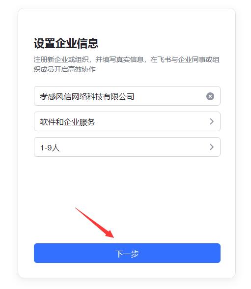 進(jìn)入“設(shè)置企業(yè)信息”界面,填寫真實(shí)的企業(yè)名稱,選擇行業(yè)類型、人員規(guī)模,點(diǎn)下一步。